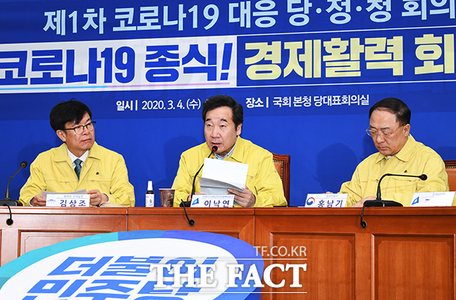 [더팩트ㅣ국회=배정한 기자] 이낙연 더불어민주당 코로나19 재난안전대책위원장(가운데)이 4일 오전 서울 여의도 국회에서 열린 더불어민주당 제1차 코로나19 대응 당정청회의에 참석해 모두발언을 하고 있다.