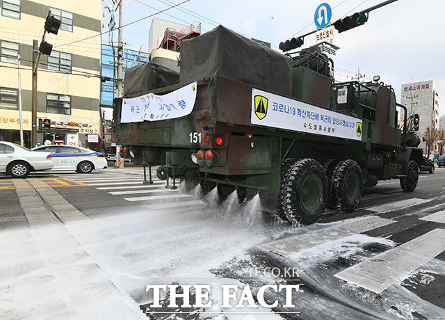 [더팩트ㅣ이동률 기자] 코로나19 확진자가 5000명을 넘은 4일 오전 서울 은평구 역촌역 일대 거리에서 수도방위사령부 소속 제독차량이 주변도로를 방역하고 있다.