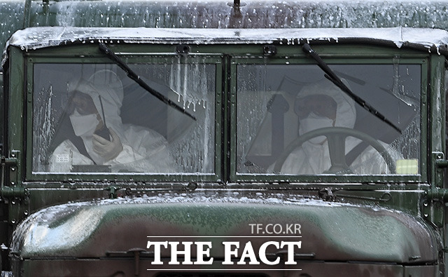 [더팩트ㅣ이동률 기자] 코로나19 확진자가 5000명을 넘은 4일 오전 서울 은평구 역촌역 일대 거리에서 수도방위사령부 소속 제독차량이 주변도로를 방역하고 있다.