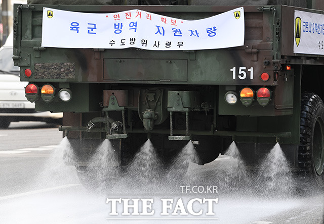[더팩트ㅣ이동률 기자] 코로나19 확진자가 5000명을 넘은 4일 오전 서울 은평구 역촌역 일대 거리에서 수도방위사령부 소속 제독차량이 주변도로를 방역하고 있다.