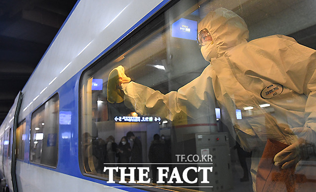 [더팩트ㅣ이새롬 기자] 한국철도공사(코레일)가 4일 서울역 승강장에서 코로나19(신종 코로나바이러스 감염증) 대응을 위한 방역작업을 실시한 가운데, 작업원들이 정차된 KTX 객실 내부 방역 작업을 하고 있다.