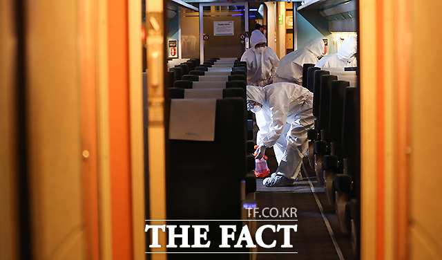 [TF포토] KTX 객실 방역하는 작업원들