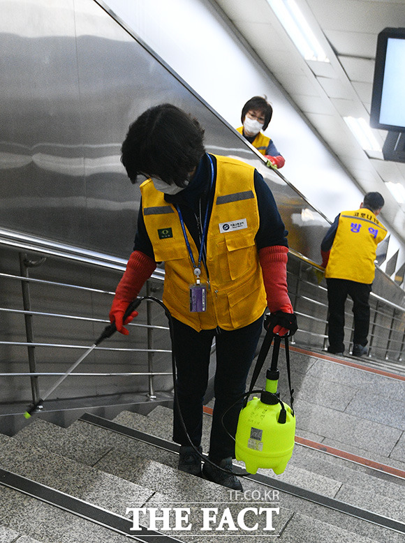 [더팩트ㅣ이동률 기자] 코로나19 확진자가 5000명을 넘은 4일 오후 서울 중구 명동역에서 서울교통공사 관계자들이 방역을 하고 있다.