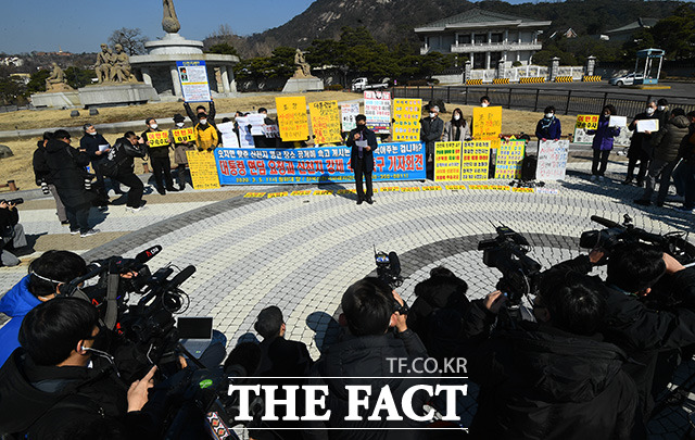 [더팩트ㅣ이동률 기자] 전국신천지피해자연대가 5일 오전 서울 종로구 청와대 사랑채 앞에서 기자회견을 열고 신천지 규탄 성명을 발표하고 있다.