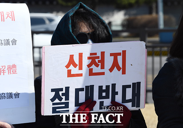 [더팩트ㅣ이동률 기자] 전국신천지피해자연대가 5일 오전 서울 종로구 청와대 사랑채 앞에서 기자회견을 열고 신천지 규탄 손팻말을 들고 목소리를 높이고 있다.