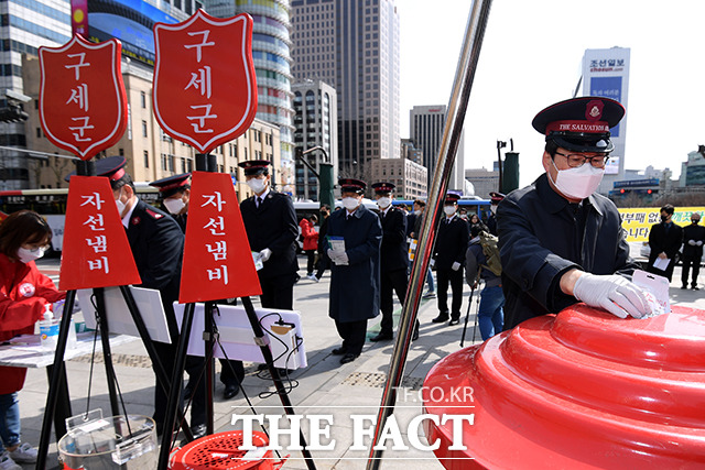 [더팩트|이선화 기자] 구세군 한국군국이 13일 오후 서울 광화문광장에서 마스크 기부 캠페인 '내 마음을 담다' 선포식을 개최한 가운데 구세군 사관들이 마스크를 기부하고 있다.