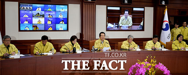 [더팩트ㅣ이덕인 기자] 정세균 국무총리(가운데)가 15일 오후 서울 종로구 서울정부청사에서 열린 코로나19 대응 중앙재난안전대책본부 회의를 주재하고 있다.