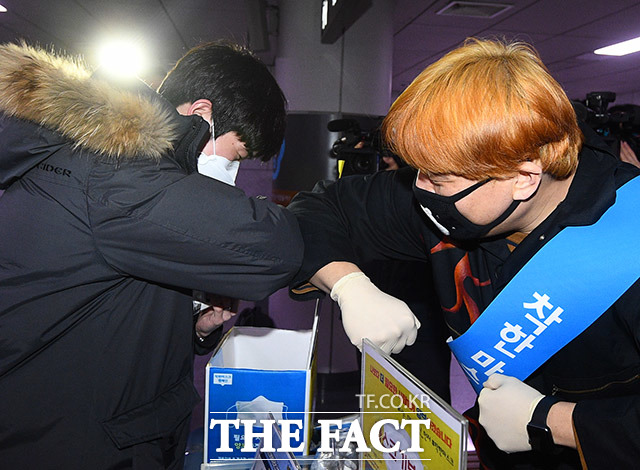 [더팩트ㅣ이동률 기자] 착한마스크 캠페인을 제안한 프로레슬러 김남훈(오른쪽)이 16일 오후 서울 중구 시청역에서 열린 착한마스크 캠페인 행사에서 시민들과 팔꿈치를 맞대며 인사를 나누고 있다.