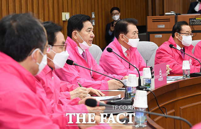 [더팩트ㅣ국회=배정한 기자] 심재철 미래통합당 원내대표(가운데)가 17일 오전 서울 국회에서 열린 원내대책회의에 참석해 모두발언을 하고 있다.