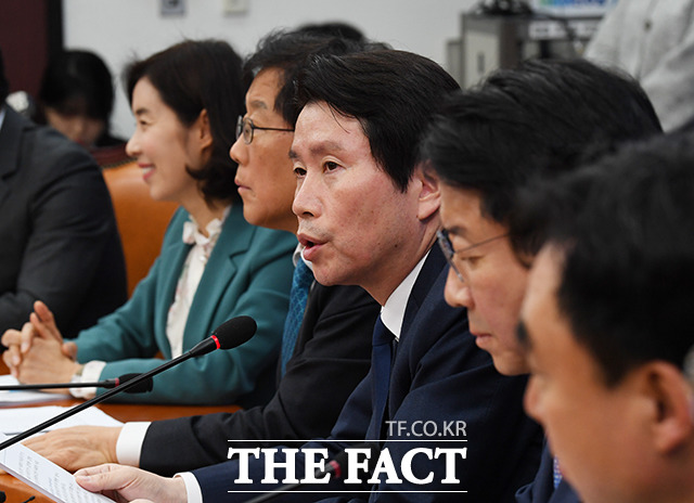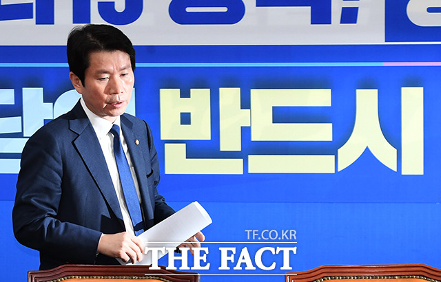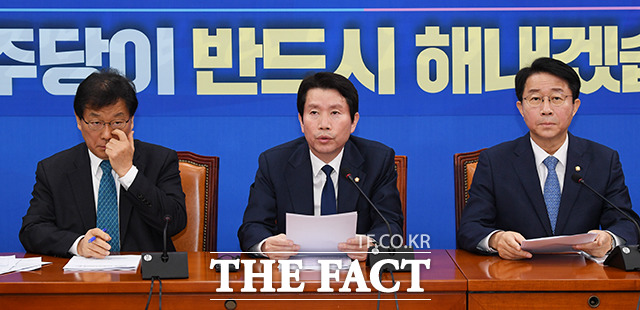 [더팩트ㅣ국회=배정한 기자] 이인영 더불어민주당 원내대표(가운데)가 17일 오전 서울 여의도 국회에서 열린 더불어민주당 원내대표단-상임위간사단 연석회의에 참석해 모두발언을 하고 있다.