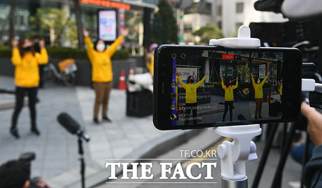 [더팩트ㅣ이동률 기자] 18일 오후 서울 종로구 옛 일본대사관 앞에서 열린 '일본군성노예제 문제해결을 위한 제1431차 정기수요시위'가 코로나19 확산 방지를 위해 온라인 생중계 진행되고 있다.