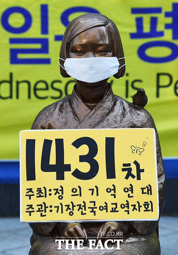 [더팩트ㅣ이동률 기자] 18일 오후 서울 종로구 옛 일본대사관 앞에서 열린 '일본군성노예제 문제해결을 위한 제1431차 정기수요시위'가 코로나19 확산 방지를 위해 온라인 생중계 진행된 가운데 소녀상에 마스크가 씌워져있다.