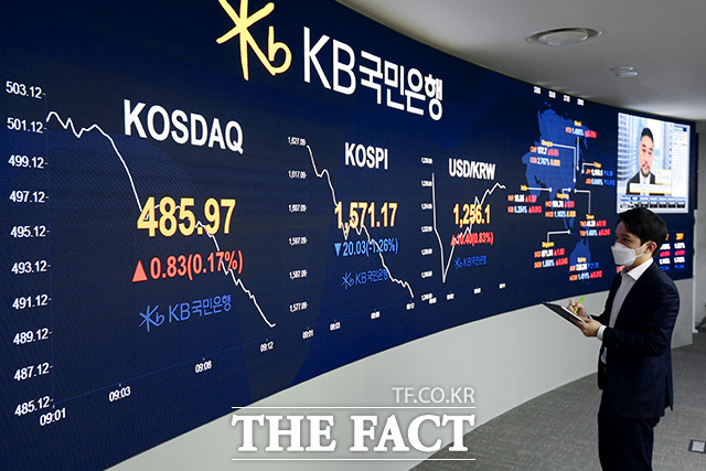 [더팩트|이선화 기자] 코로나19 여파로 국제 증시가 불안정한 상태를 이어가고 있는 19일 오전 서울 영등포구 KB국민은행 딜링룸에서 딜러들이 지수 현황을 주시하고 있다.