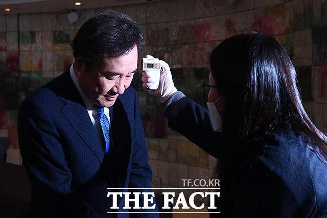 [더팩트ㅣ이동률 기자] 이낙연 더불어민주당 공동상임선거대책위원장이 19일 오전 서울 중구 프레스센터에서 열린 관훈토론회에 참석하기 전 입구에서 체온을 측정하고 있다.
