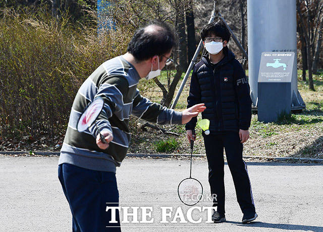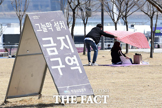[더팩트ㅣ이동률 기자] 코로나19 지역사회 확산을 막기 위 한 '사회적 거리두기' 운동이 일고 있는 23일 오후 서울 영등포구 여의도한강공원을 찾은 시민들이 마스크를 쓴채 봄 기운을 만끽하고 있다.