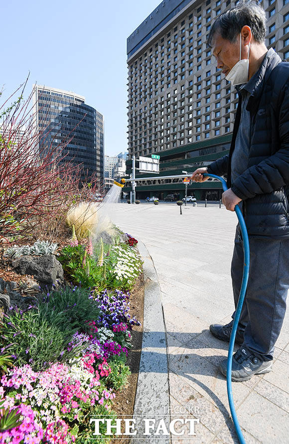 [더팩트ㅣ김세정 기자] 전국이 맑고 포근한 봄날씨를 보인 24일 오후 서울 중구 시청 앞 서울광장에서 한 관계자가 꽃에 물을 주고 있다.