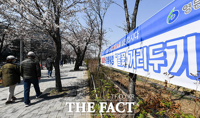 [더팩트ㅣ김세정 기자] 완연한 봄날씨를 보인 30일 오후 서울 영등포구 여의도 윤중로 벚꽃길에 '사회적 거리두기' 안내 현수막이 걸려 있다.
