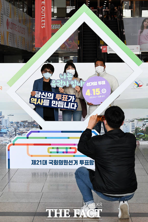 [더팩트ㅣ남용희 기자] 서울시선거관리위원회 제21대 국회의원 선거 '아름다운 선거 정보관'이 개관한 1일 오전 서울 용산구 서울역을 찾은 시민들이 포토존에서 기념촬영을 하고 있다.