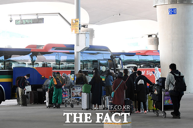 [더팩트ㅣ인천국제공항=남용희 기자] 코로나19 확진자가 급증하고 있는 이탈리아의 교민들이 1일 오후 전세기를 타고 인천국제공항 제2터미널을 통해 귀국해 버스로 이동하고 있다.