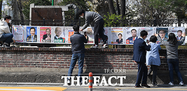[더팩트ㅣ이새롬 기자] 제 21대 국회의원 선거운동 개시일인 2일 오후 서울 종로구 이화동 일대에서 종로구 선거관리위원회 직원들이 선거 벽보를 부착하고 있다.