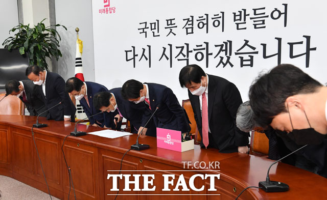 [더팩트 | 국회=남윤호 기자] 심재철 미래통합당 대표 권한대행(왼쪽에서 네 번째)와 당직자들이 17일 오전 서울 여의도 국회에서 열린 중앙선거대책위원회 해단식에 참석해 고개를 숙이고 있다.