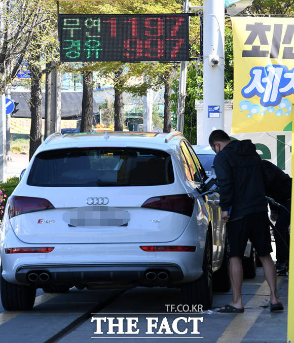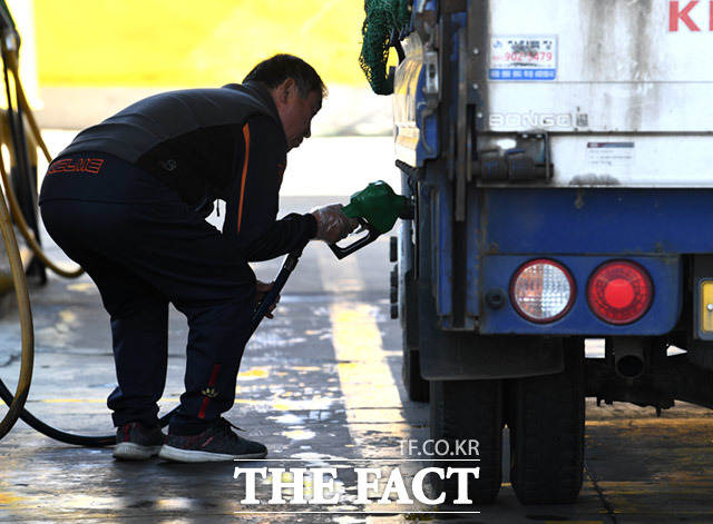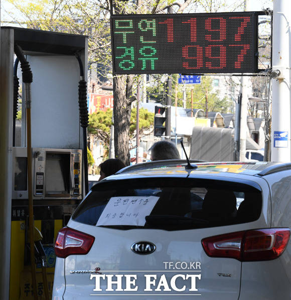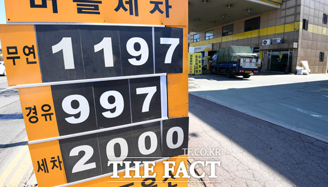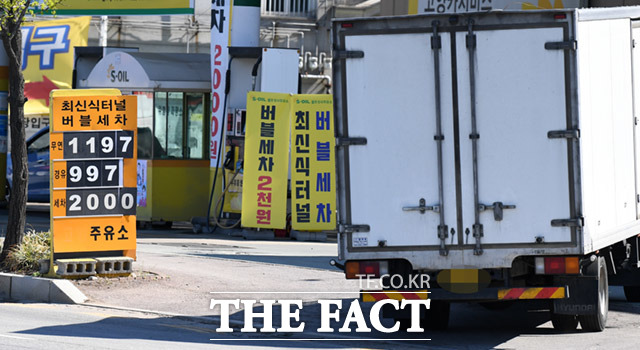 [더팩트ㅣ고양=임세준 기자] 전국 주유소 휘발유 가격이 12주 연속 하락하고 있는 가운데 18일 오전 경기도 고양시 덕양구 성사동의 한 주유소 입구 가격표에 휘발유가 1100원대의 가격을 보이고 있다.