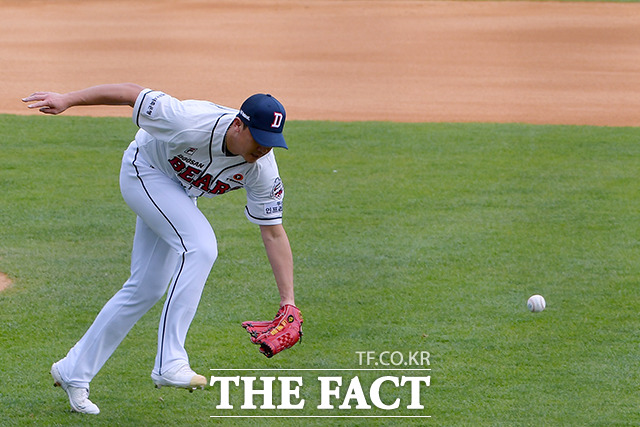 [더팩트|이선화 기자] 22일 오후 서울 송파구 잠실야구장에서 2020 KBO리그 두산베어스와 키움 히어로즈의 연습경기가 열린 가운데 키움 서건창이 타격한 공이 두산 투수 이용찬 옆으로 지나가고 있다.