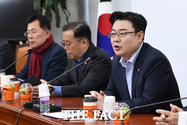 [더팩트 | 국회=남윤호 기자] 김성원 미래통합당 의원(오른쪽)이 23일 오후 서울 여의도 국회에서 열린 미래통합당 재선 당선자 모임에 참석해 발언하고 있다. 왼쪽부터 이만희, 박성중, 김성원 의원.