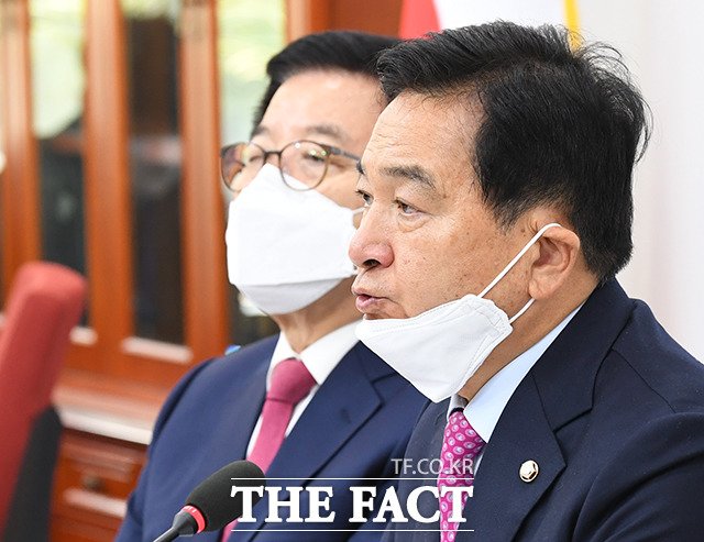 [더팩트ㅣ국회=배정한 기자] 심재철 미래통합당 당대표 권한대행(오른쪽)이 27일 오전 서울 여의도 국회에서 열린 미래통합당 최고위원회의에 참석해 발언을 하고 있다.