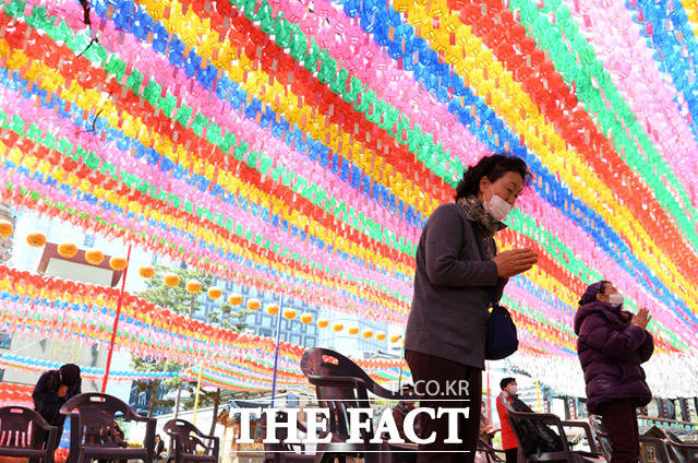 [더팩트ㅣ임세준 기자] 부처님오신날을 앞둔 28일 오전 서울 종로구 조계사 경내에 오색연등이 화려하게 걸려있는 가운데 교인들이 야외에서 기도를 드리고 있다.