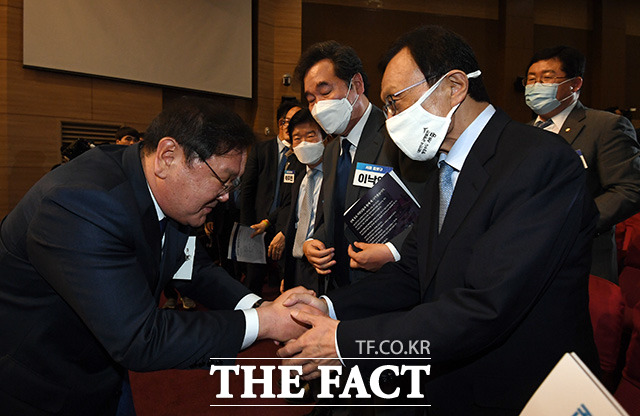 [더팩트ㅣ국회=임영무 기자] 제21대 국회 더불어민주당 제1기 원내대표에 선출된 김태년 의원(왼쪽)이 7일 오후 서울 여의도 국회 의원회관에서 열린 원내대표 선출 당선인 총회를 마친뒤 이해찬 대표에게 허리 숙여 인사를 하고 있다.darkroom@tf.co.kr사진영상기획부 photo@tf.co.kr