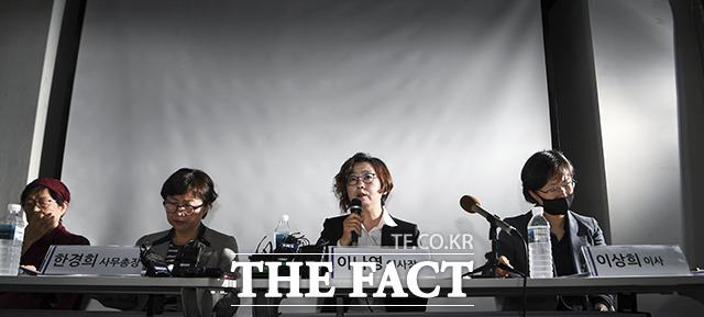 [더팩트ㅣ배정한 기자] 이나영 정의기억연대 이사장(왼쪽 세번째)이 11일 오전 서울 마포구 인권재단 사람에서 진행된 기자회견에서 기부금 논란 관련 발언을 하고 있다.