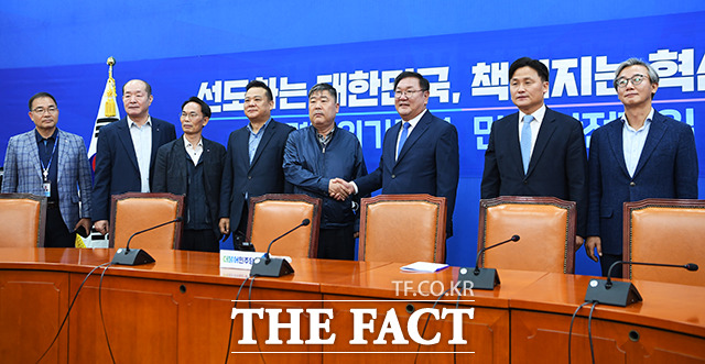[더팩트ㅣ국회=배정한 기자] 김동명 한국노동조합총연맹 위원장(왼쪽 다섯번째)이 19일 오전 서울 여의도 국회에서 김태년 더불어민주당 원내대표(왼쪽 여섯번째)를 예방해 악수를 하고 있다.