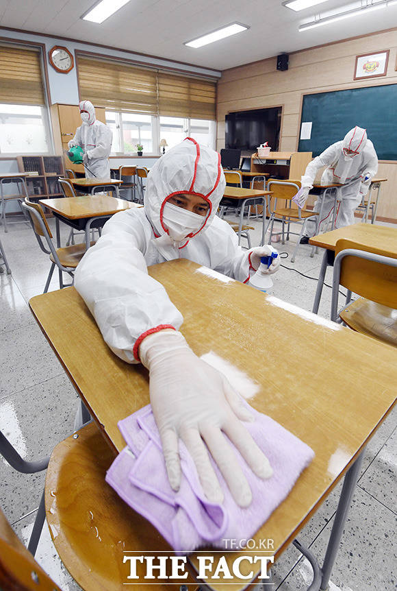 [더팩트ㅣ수원=임영무 기자] 고등학교 3학년 등교를 하루 앞둔 19일 오후 경기도 수원 삼일공업고등학교 교직원들이 교실을 방역하고 있다.
