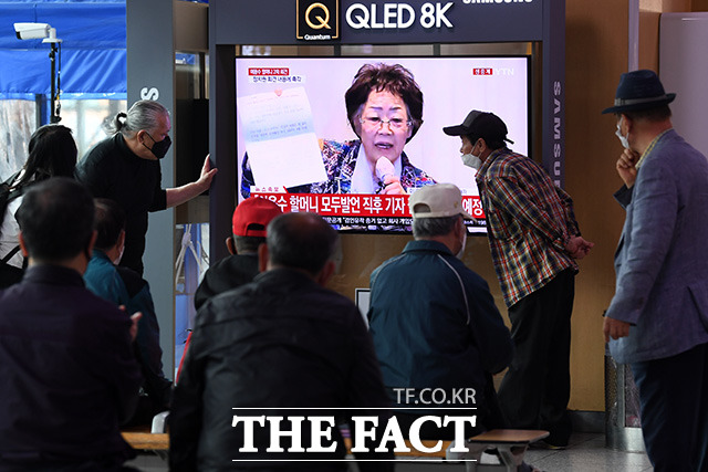 [더팩트ㅣ남용희 기자] 정의기억연대 기부금 의혹을 폭로했던 위안부 피해자 이용수 할머니가 대구에서 두 번째 기자회견을 갖은 25일 오후 서울 용산구 서울역에서 시민들이 기자회견 생중계를 지켜보고 있다.