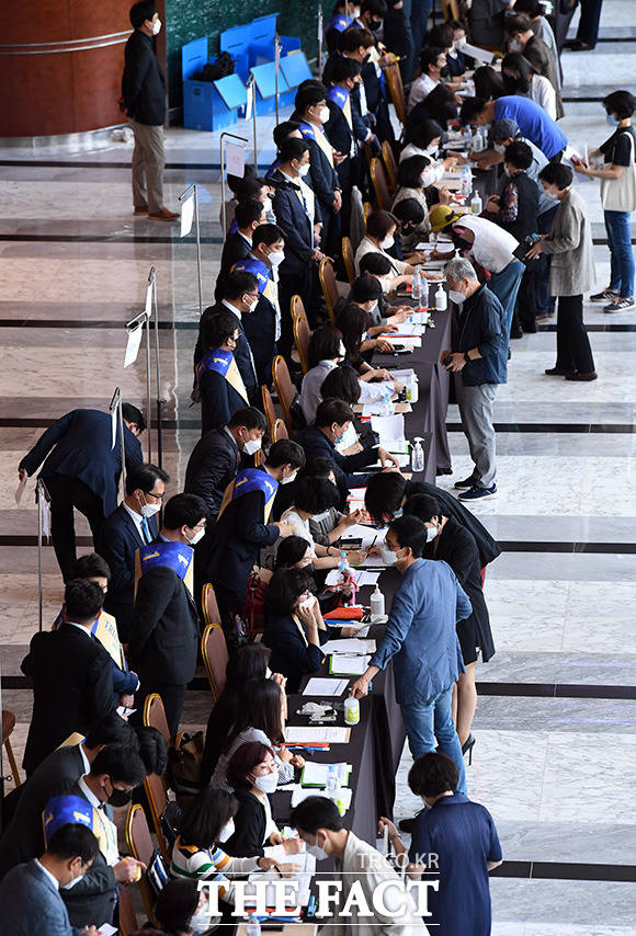 [더팩트ㅣ임영무 기자] 강남 재건축 최대어로 불리는 서울 서초구 '반포주공1단지 3주구' 시공사가 선정 총회가 30일 오후 서울 강남구 코엑스에서 열린 가운데 사업지역 조합원들이 총회에 참석하기 위해 명부를 확인하고 있다.darkroom@tf.co.kr사진영상기획부 photo@tf.co.kr
