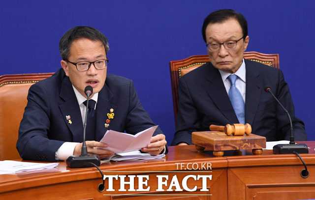 [더팩트 | 국회=남윤호 기자] 박주민 더불어민주당 최고위원(왼쪽)이 3일 오전 서울 여의도 국회에서 열린 최고위원회의에 참석해 모두발언 하고 있다. 오른쪽은 이해찬 대표.