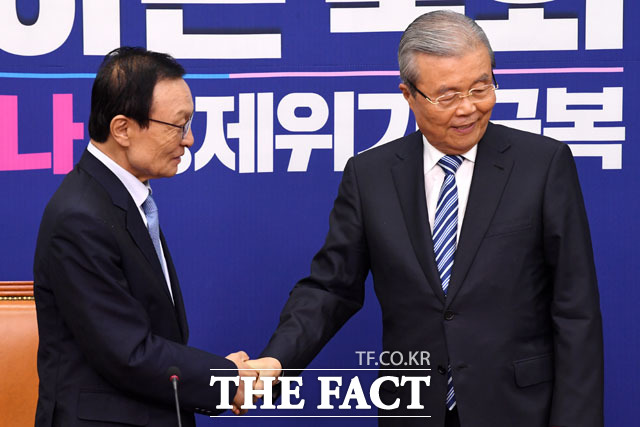 [더팩트 | 국회=남윤호 기자] 김종인 미래통합당 비상대책위원장(오른쪽)이 3일 오전 서울 여의도 국회에서 이해찬 더불어민주당 대표를 예방해 악수를 나눈 후 자리로 돌아가고 있다.