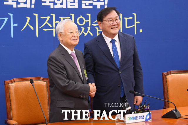 [더팩트 | 국회=남윤호 기자] 손경식 한국경영자총협회장(왼쪽)이 3일 오후 서울 여의도 국회에서 김태년 더불어민주당 원내대표를 예방해 악수하고 있다.