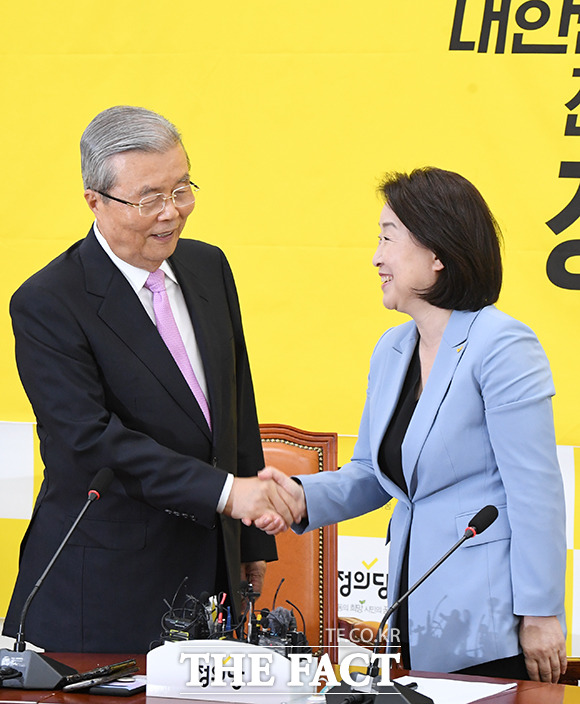 [더팩트ㅣ국회=배정한 기자] 김종인 미래통합당 비상대책위원장(왼쪽)이 4일 오전 서울 여의도 국회에서 심상정 정의당 대표를 예방해 인사를 하고 있다.