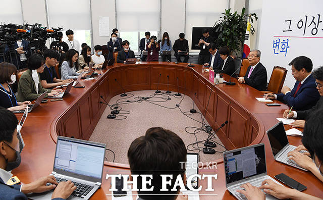 김종인 미래통합당 비상대책위원장이 4일 오후 서울 여의도 국회에서 열린 기자간담회에 참석해 취재진의 질문에 답변을 하고 있다. / 국회=배정한 기자