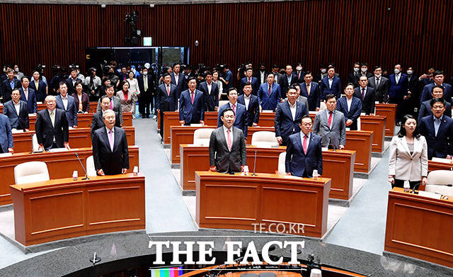 [더팩트|국회=이선화 기자] 김종인 미래통합당 비상대책위원장과 주호영 미래통합당 원내대표가 4일 오후 서울 여의도 국회에서 열린 미래통합당 의원총회에 참석해 국민의례를 하고 있다.