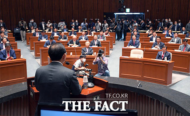 이날 의원총회에 참석한 김 비대위원장은 모두발언에서 "내일 의장 선출을 위해 국회 소집이 있어야 한다"며 "국회는 야당이 존재하지 않으면 별 의미가 없는 것"이라고 말했다.