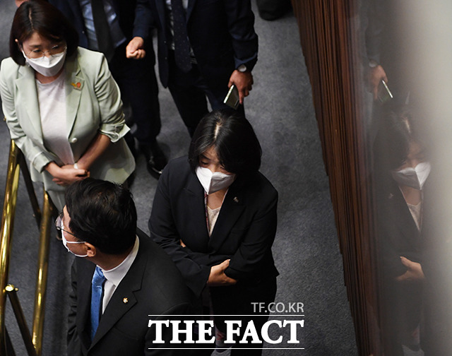 [더팩트ㅣ국회=배정한 기자] 윤미향 더불어민주당 의원(가운데)이 5일 오전 서울 여의도 국회에서 열린 제21대 국회 첫 본회의에 참석해 국회의장 투표를 하고 있다.