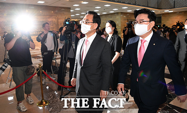 [더팩트ㅣ국회=배정한 기자] 주호영 미래통합당 원내대표(가운데)가 5일 오전 서울 여의도 국회에서 열린 제21대 국회 첫 본회의에 참석하고 있다. hany@tf.co.kr 사진영상기획부 photo@tf.co.kr