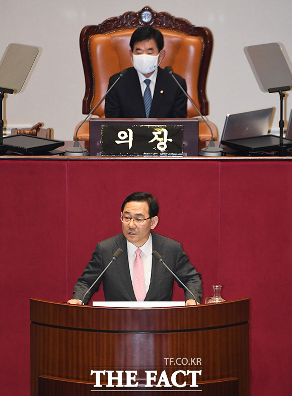 [더팩트ㅣ국회=배정한 기자] 주호영 미래통합당 원내대표(아래쪽)가 5일 오전 서울 여의도 국회에서 열린 제21대 국회 첫 본회의에 참석해 의사진행발언을 하고 있다. hany@tf.co.kr 사진영상기획부 photo@tf.co.kr