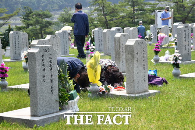 [더팩트 | 남윤호 기자] 제65회 현충일인 6일 오전 서울 동작구 국립서울현충원에서 참전용사 유가족이 참배를 하고 있다.