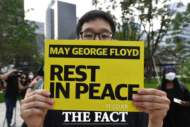 [더팩트 | 남윤호 기자] 6일 오후 미국 경찰의 과잉진압으로 사망한 조지 플로이드를 추모하는 시민들이 서울 중구 명동역에서 청계천 한빛광장까지 추모행진을 한 뒤 피켓을 들고 있다.