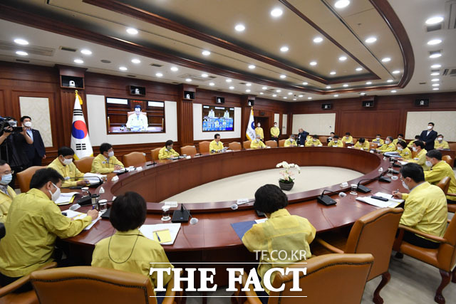 [더팩트 | 남윤호 기자] 정세균 국무총리가 7일 오후 서울 종로구 정부서울청사에서 코로나19 중앙재난안전대책본부 회의를 주재하며 모두발언을 하고 있다. 왼쪽부터 유은혜 사회부총리 겸 교육부 장관, 정세균 총리, 최기영 과학기술정보통신부 장관.