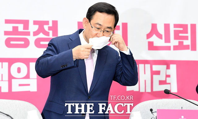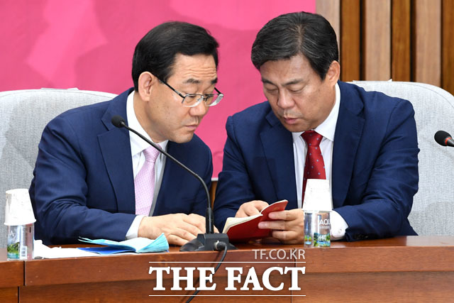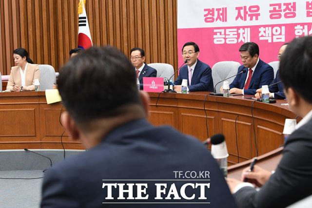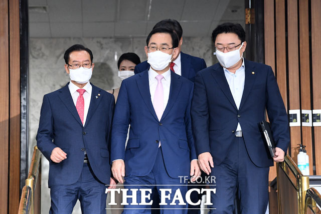 [더팩트 | 국회=남윤호 기자] 주호영 미래통합당 원내대표(가운데)가 9일 오전 서울 여의도 국회에서 열린 원내대책회의에 참석해 모두발언을 하고 있다. 왼쪽부터 이종배 정책위의장, 주호영 원내대표, 김선동 사무총장.